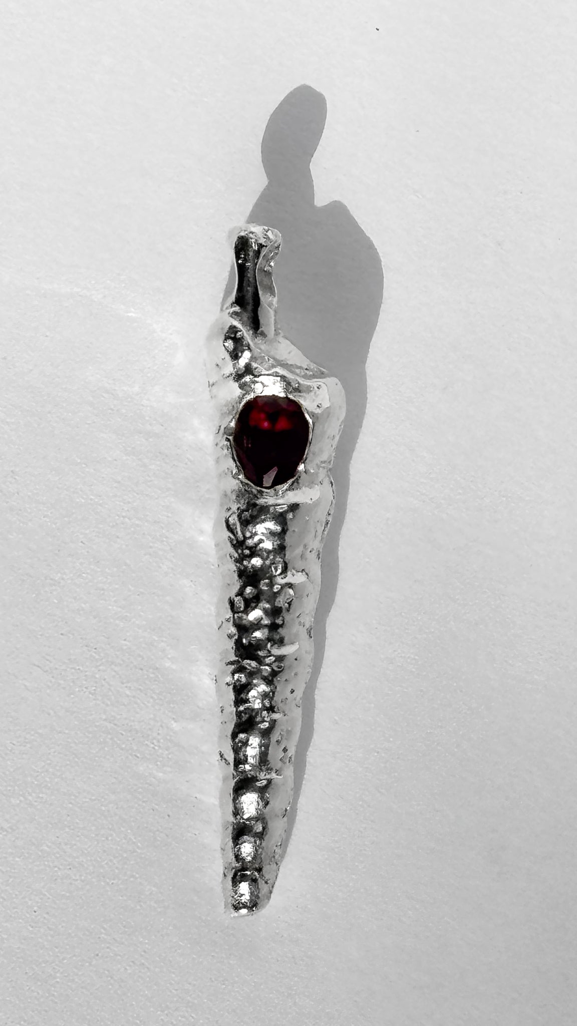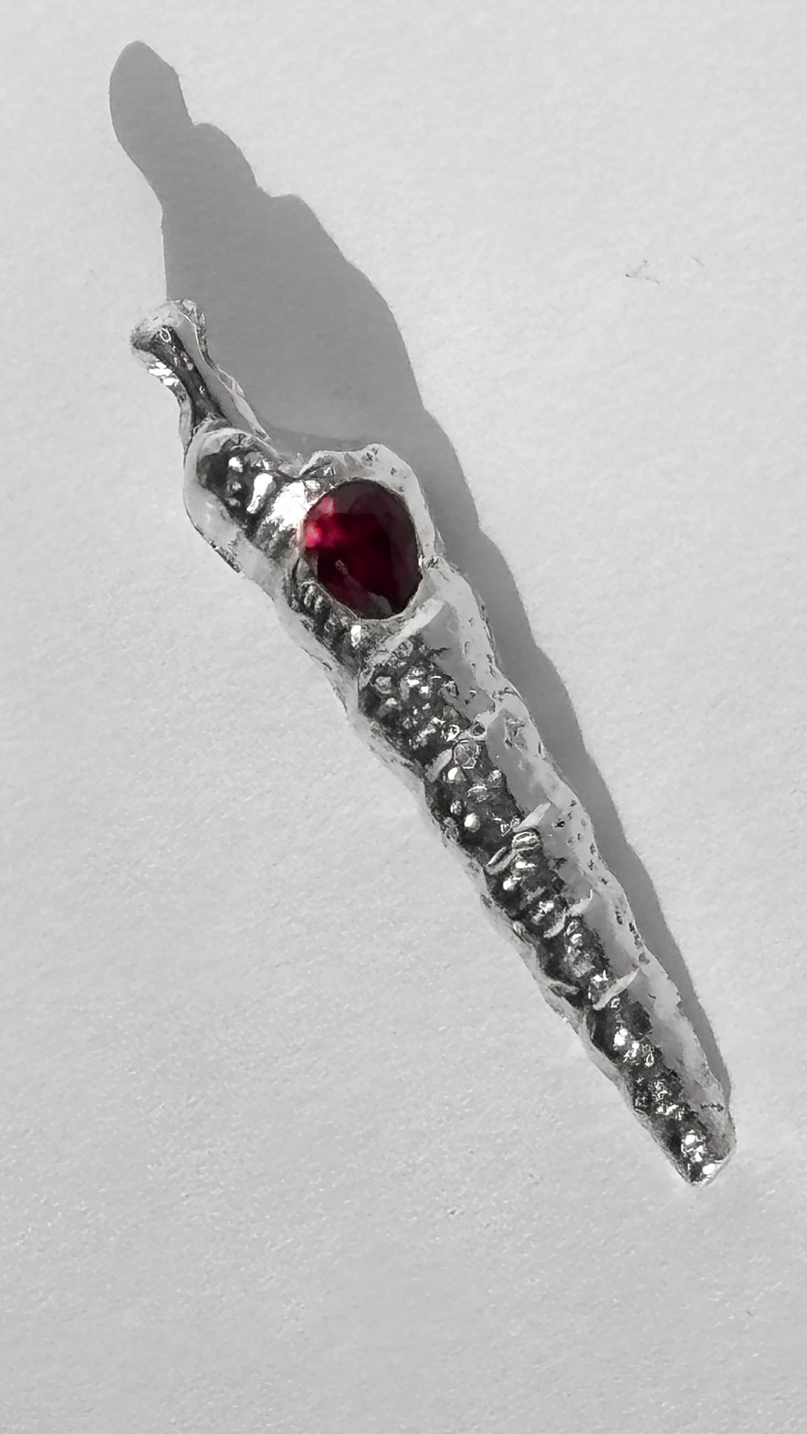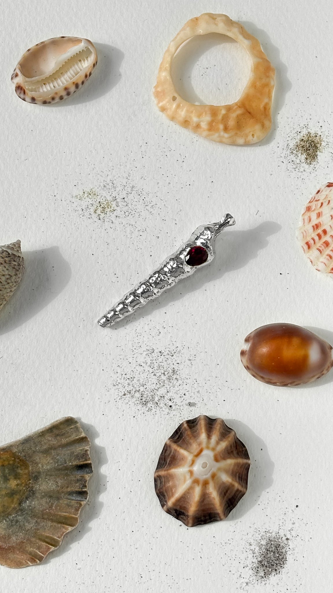 A shell brought back from a trip to Portugal, was sand cast using recycled sterling silver. A moody deep red lab-grown ruby was cast in place to add colour, dimension, and glamour.