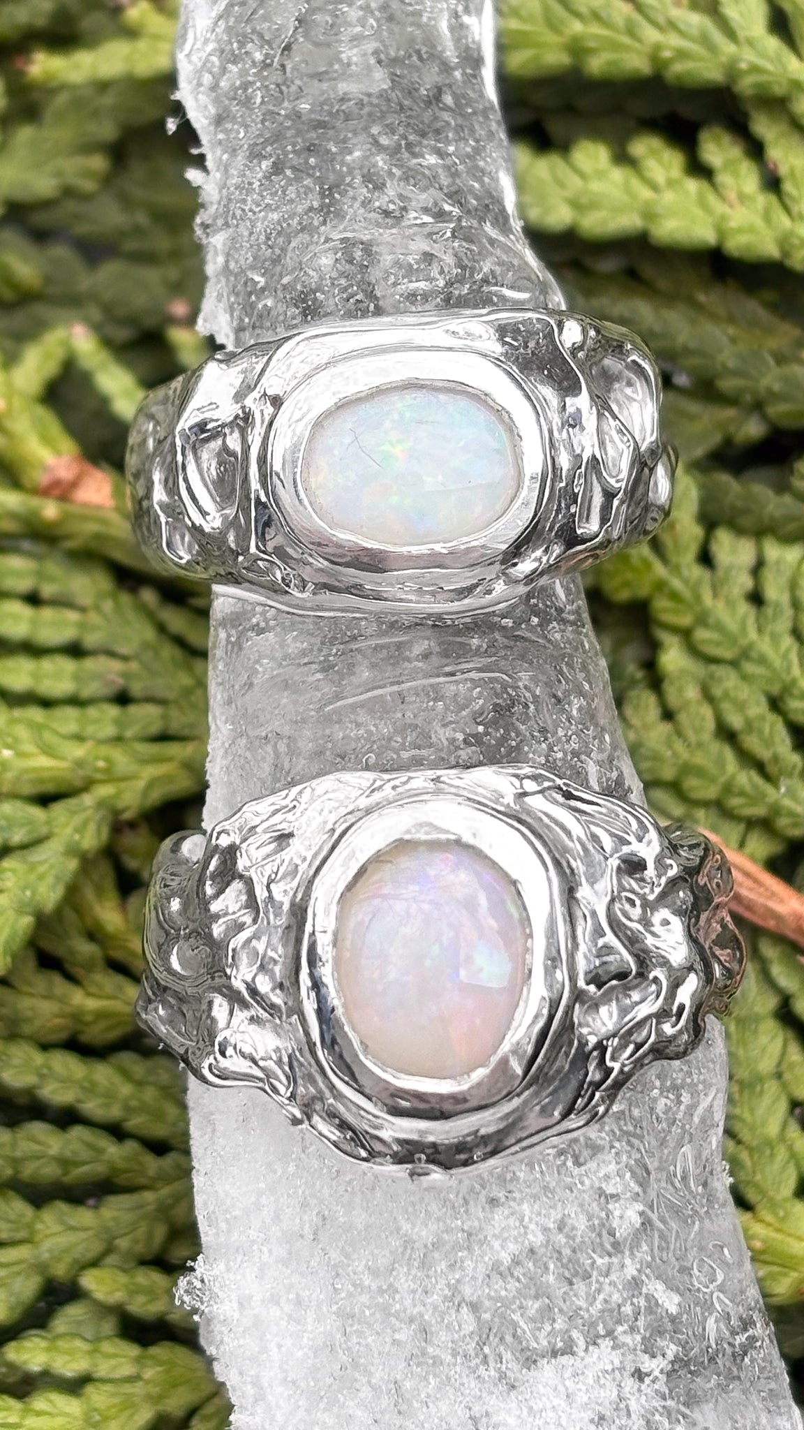 This sparkling Australian crystal opal was chosen as it beautiful mimics the dazzling snow, while it is bezel set into rippling waves of silver frozen in time.