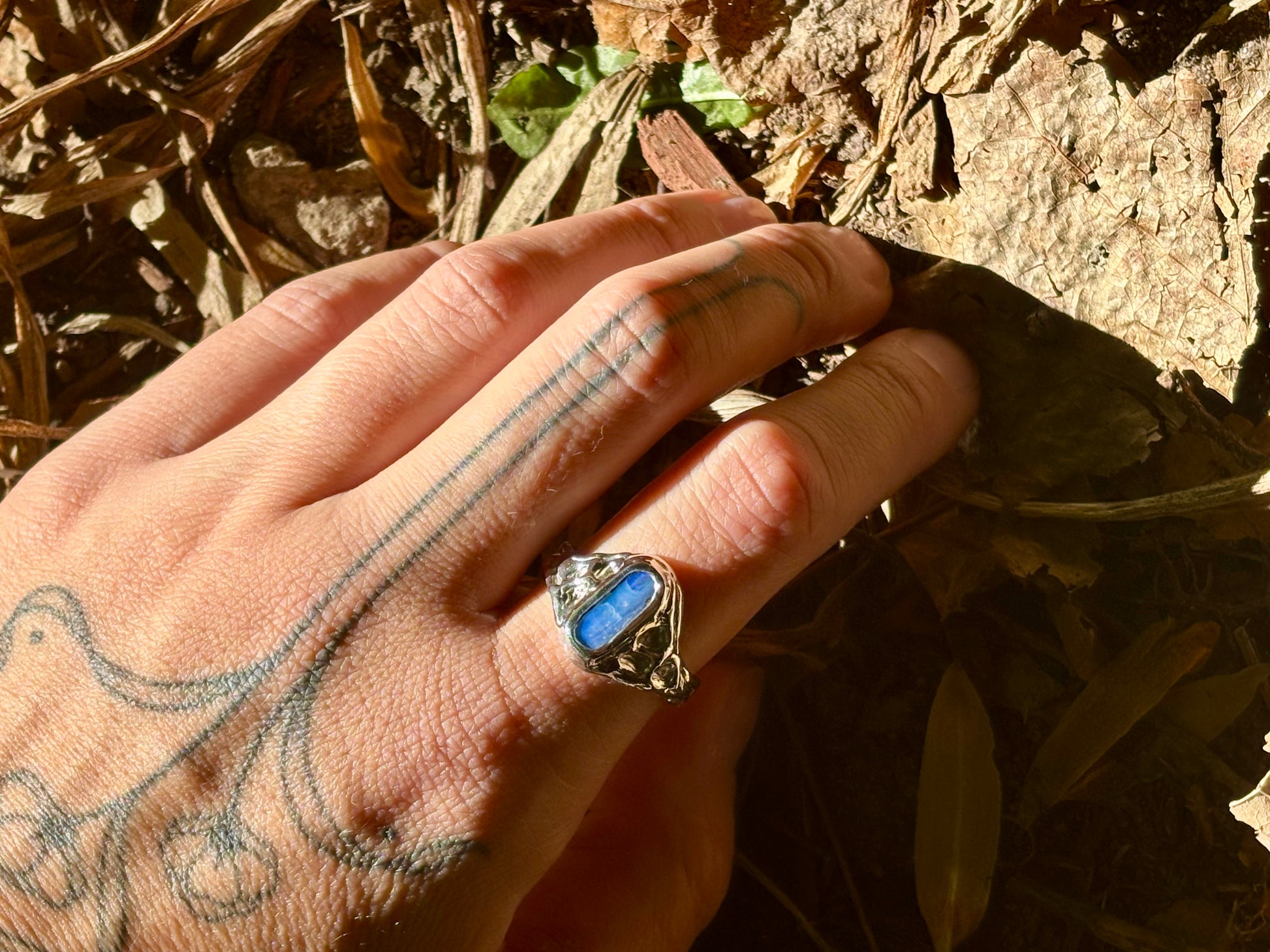 The Maera Ring holds a bright and cheerful blue Australian boulder opal. A soft shimmer reveals itself in full sunlight.