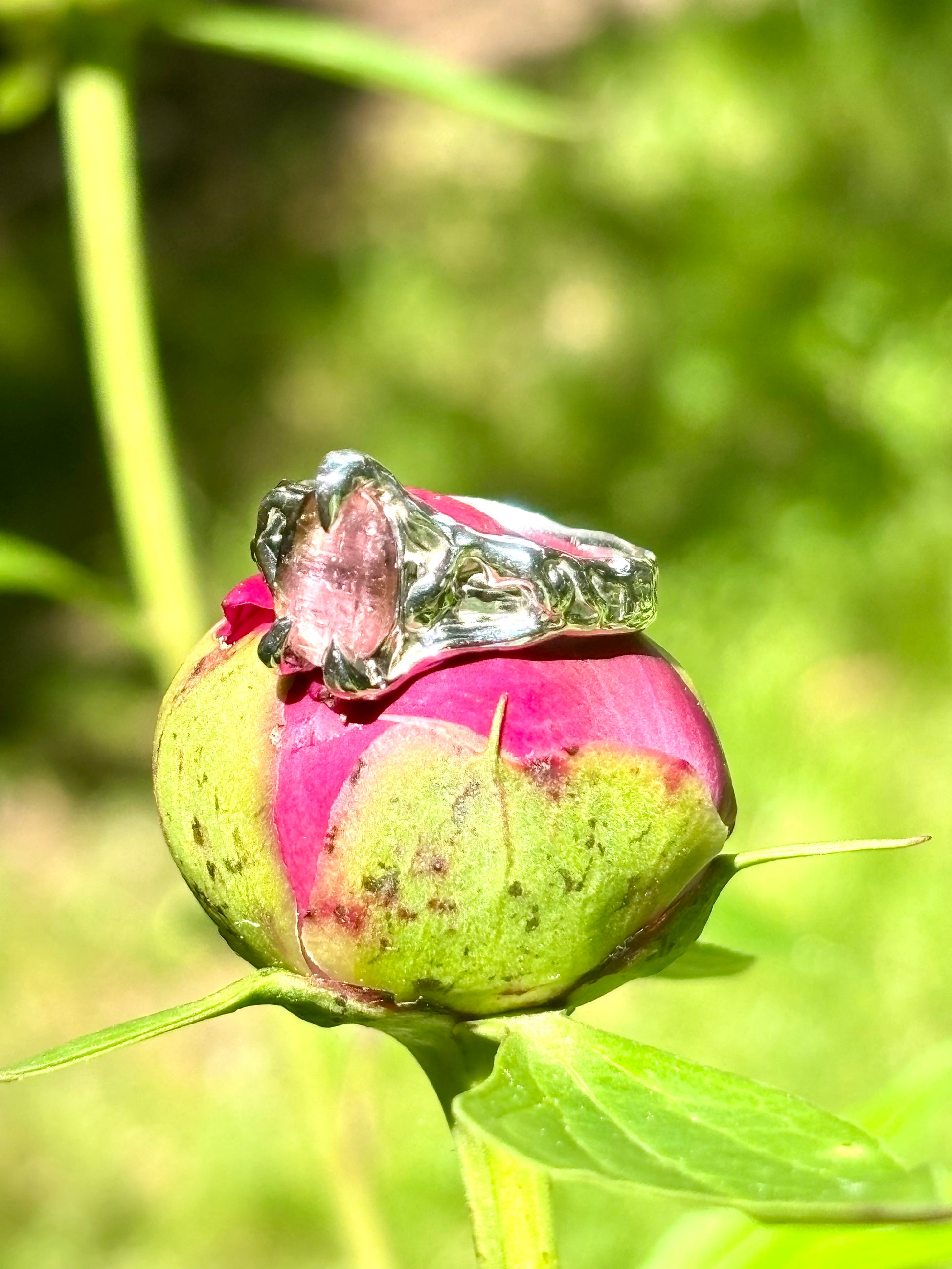 A solid sterling silver band, dances and ripples like roots making their way through the soil. Reaching out and securing the foundation for something beautiful to unfold. A sparkling, soft pink tourmaline. A sharp clawed setting, holding her close. Thorn and flower. Flourishing together.
