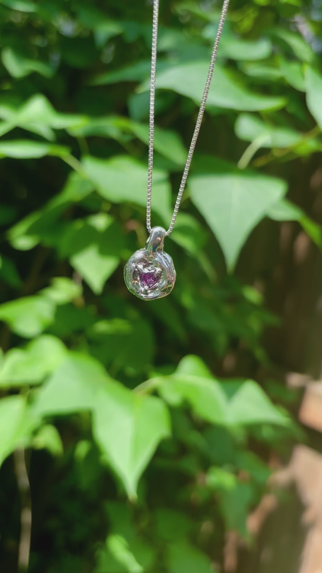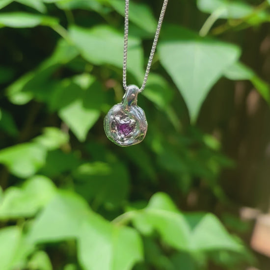 A hand carved pendant, sand cast using recycled sterling silver. Featuring a purple heart shaped cubic zirconia. High polished back.