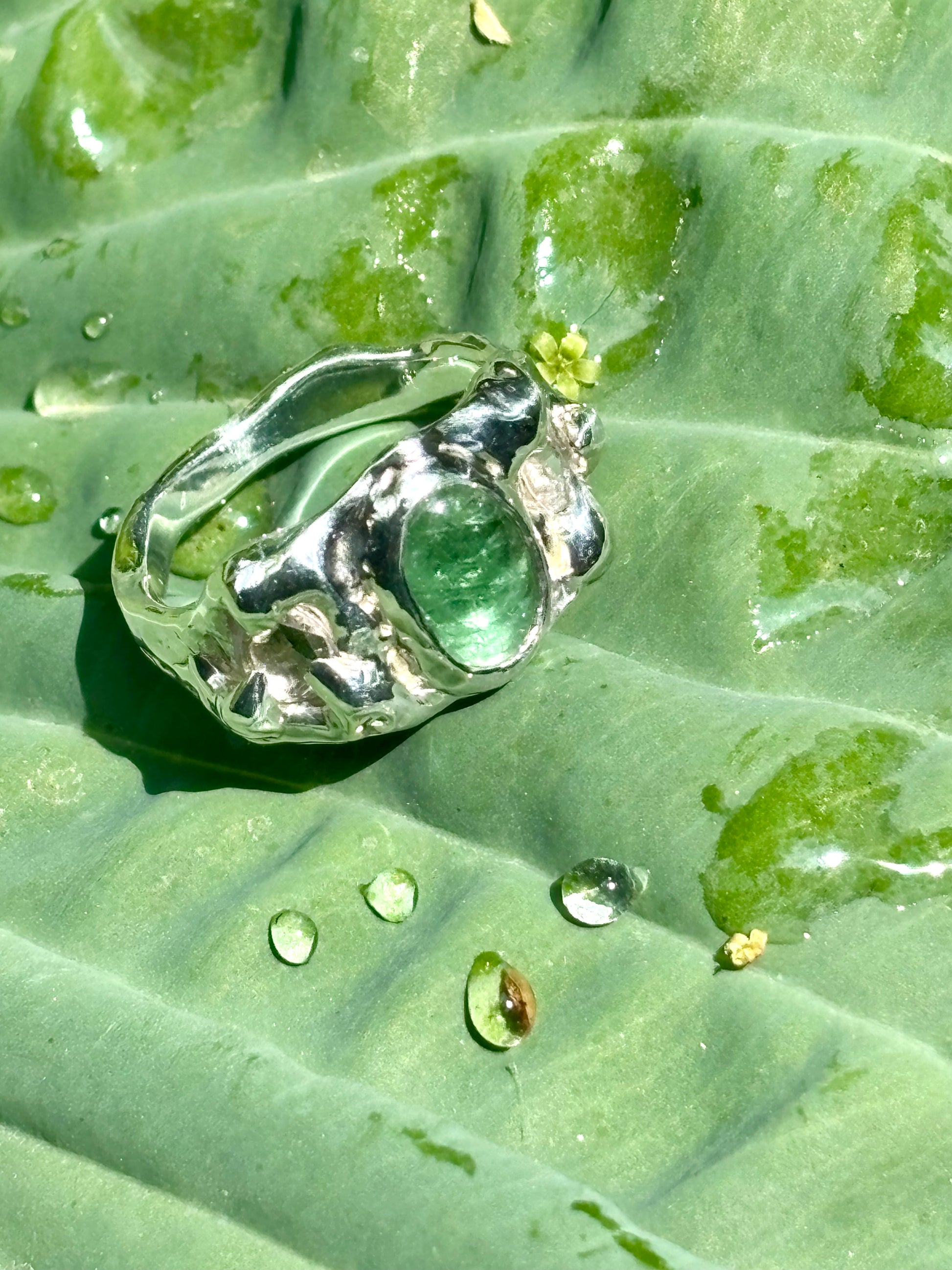 Featuring a fresh green tourmaline centre, flanked by two claw-set sparkly sapphires.